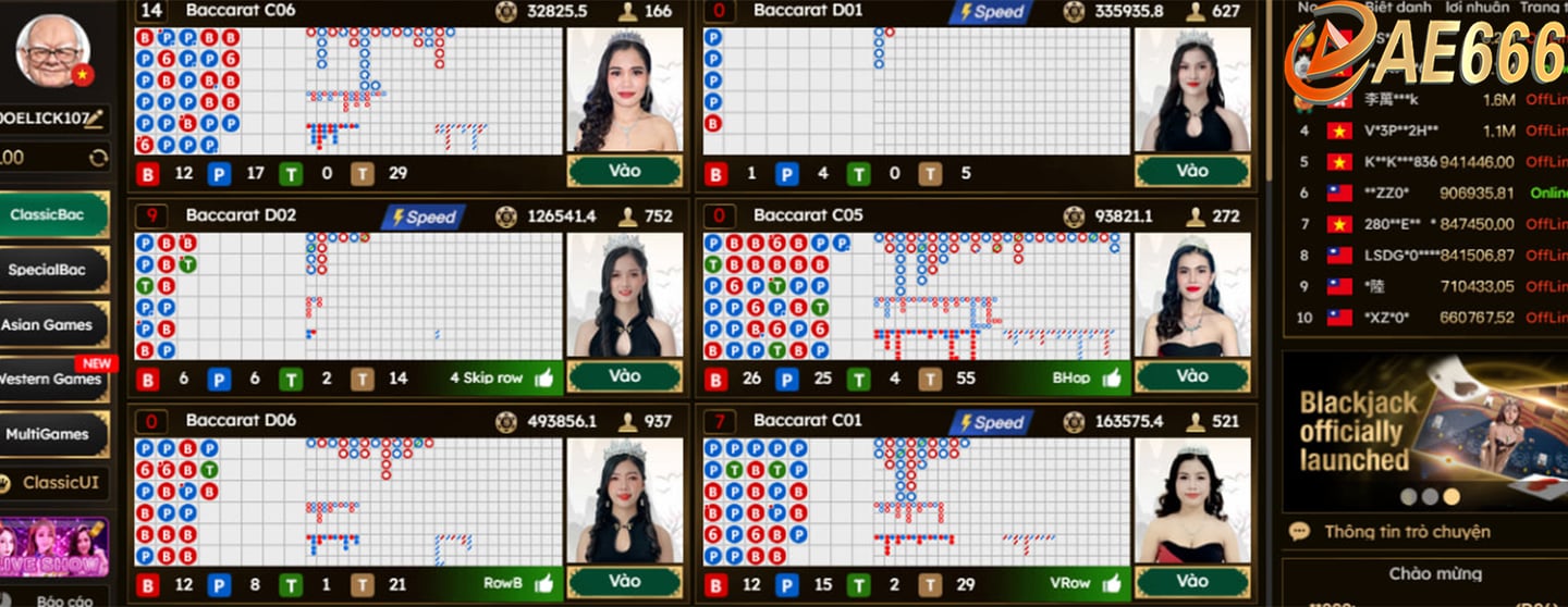Hiện tại, AE666 đang hợp tác với nhiều nhà phát hành game uy tín nhằm cung cấp kho trò chơi phong phú, chất lượng. Nổi bật như: Baccarat, Rồng Hổ, Tài Xỉu, Blackjack, Xúc Xắc, Roulette,…